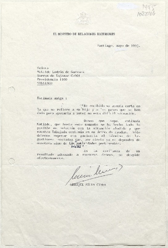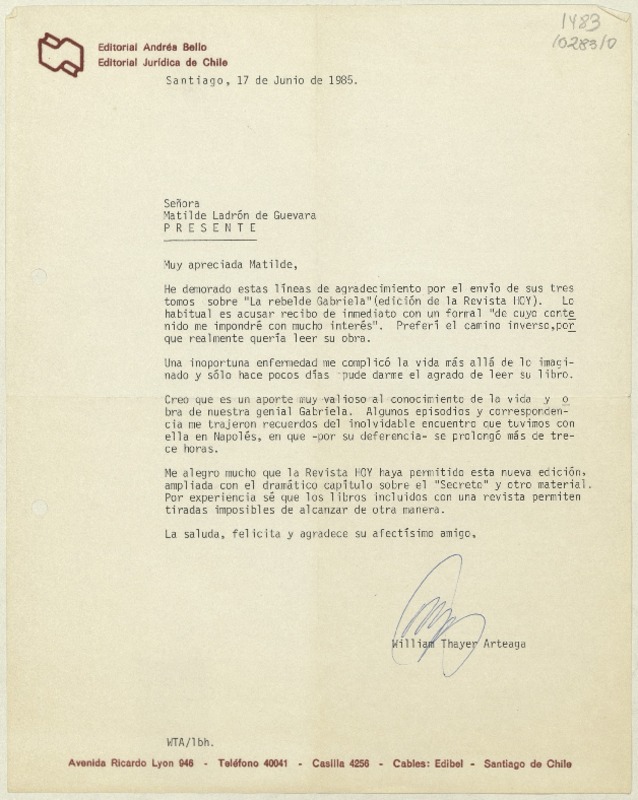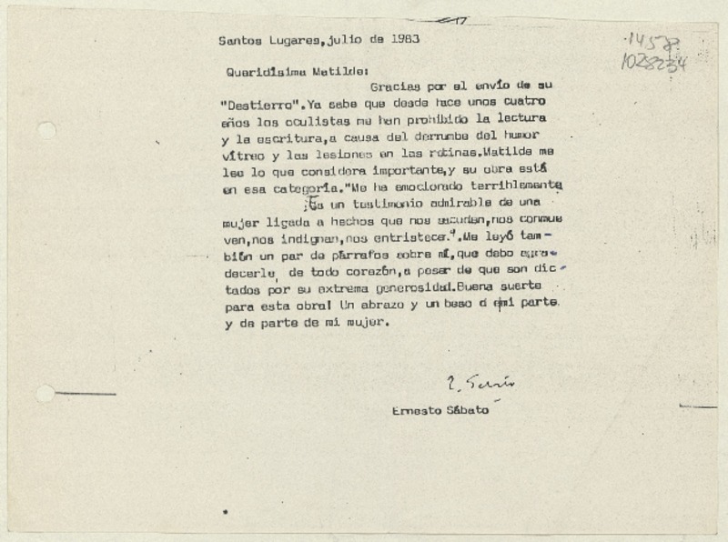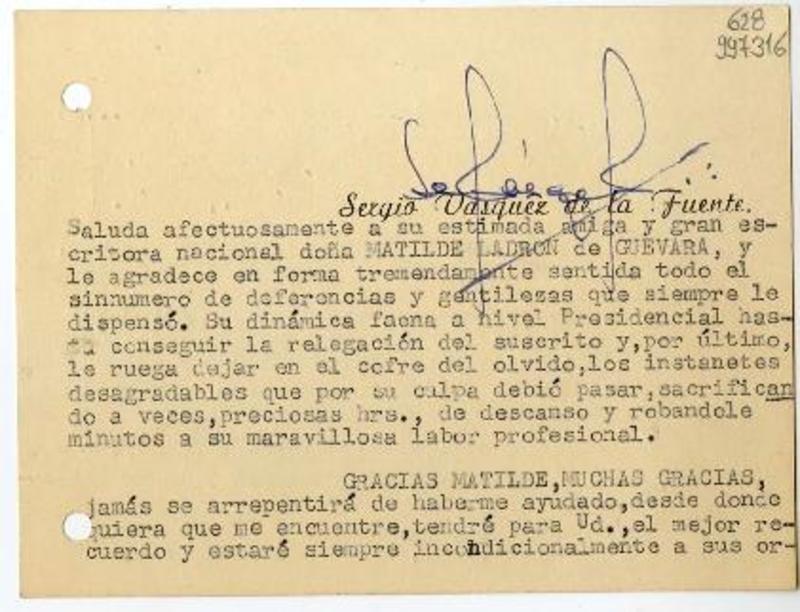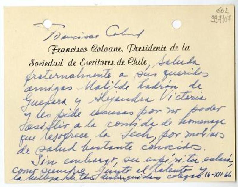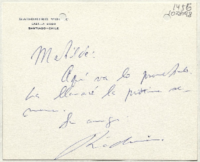 [Tarjeta] [1983?], Santiago, Chile [a] Matilde Ladrón de Guevara [manuscrito] Sergio Valech.