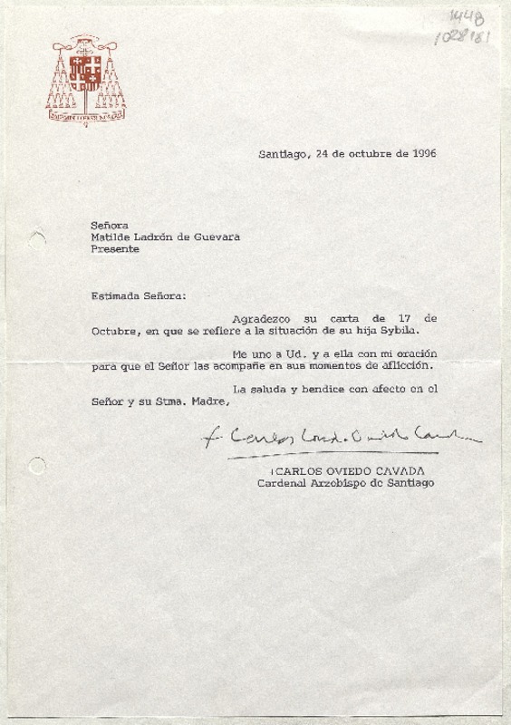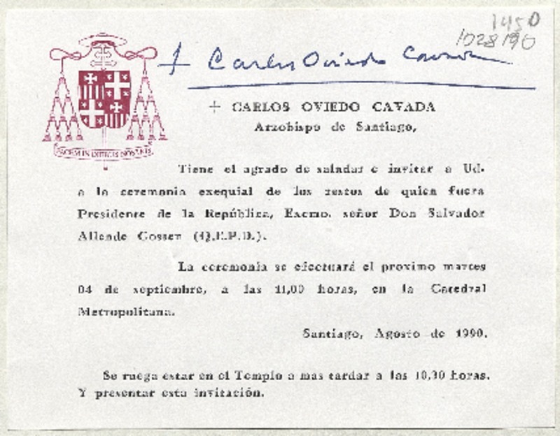 [Tarjeta] 1990 agosto, Santiago, Chile [a] Matilde Ladrón de Guevara [manuscrito] Carlos Oviedo Cavada.