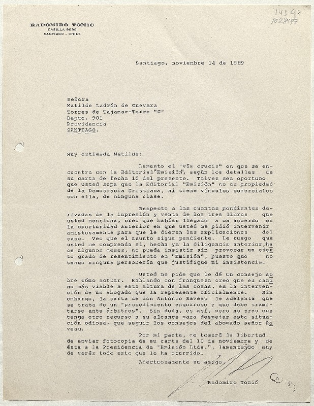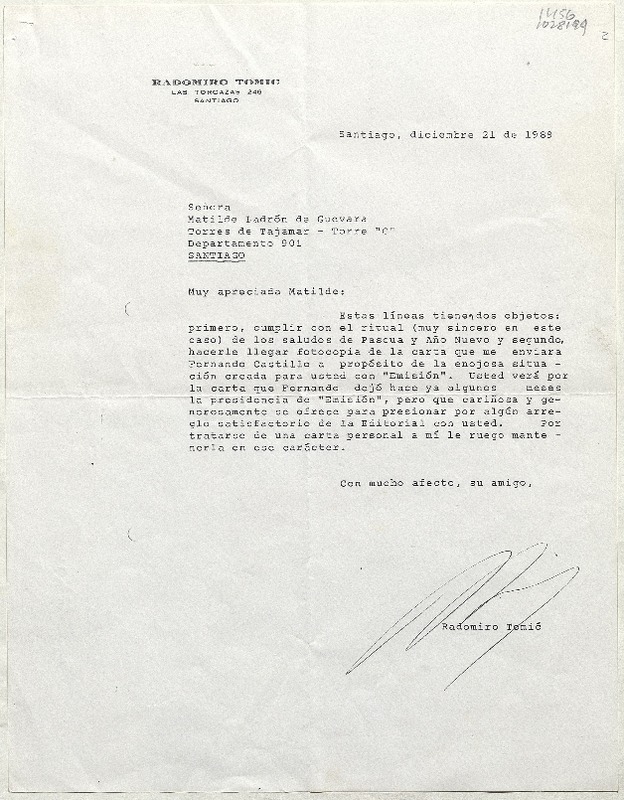 [Tarjeta] [1987], Santiago, Chile [a] Matilde Ladrón de Guevara [manuscrito] Radomiro Tomic.