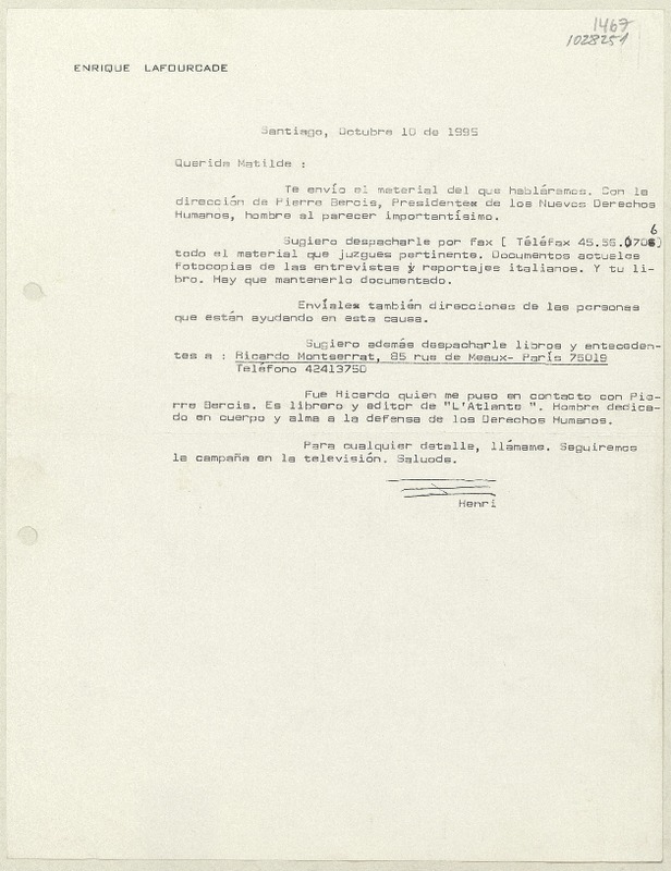 [Tarjeta] [1995], Santiago, Chile [a] Matilde Ladrón de Guevara [manuscrito] Enrique Laforcade.