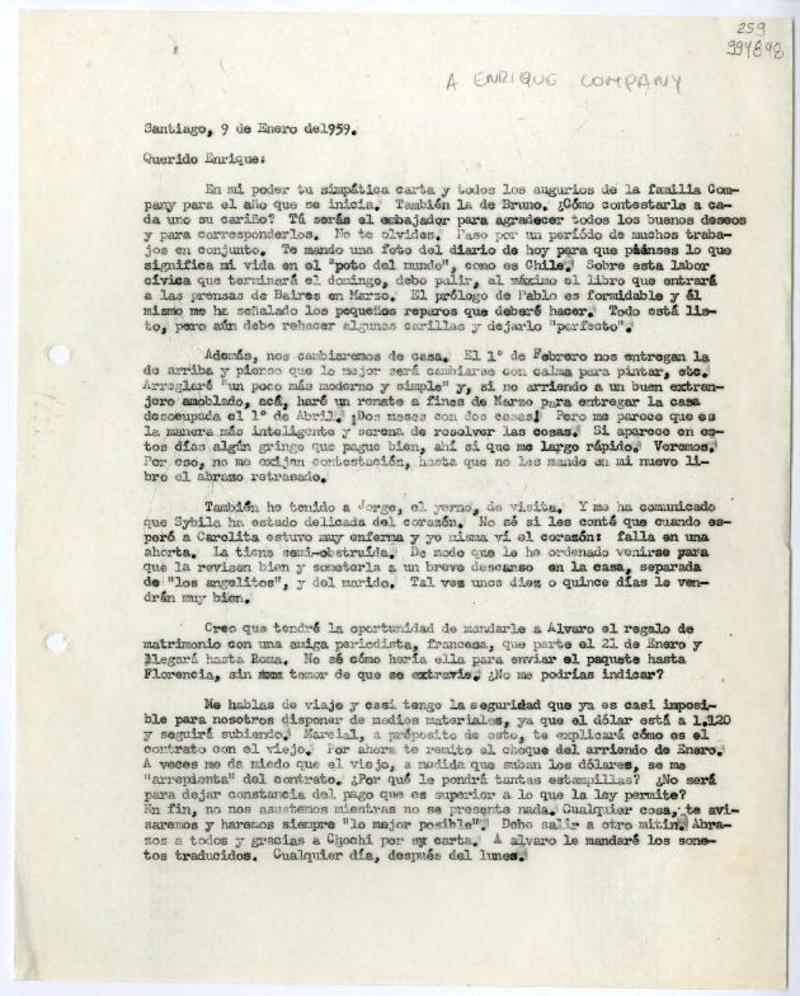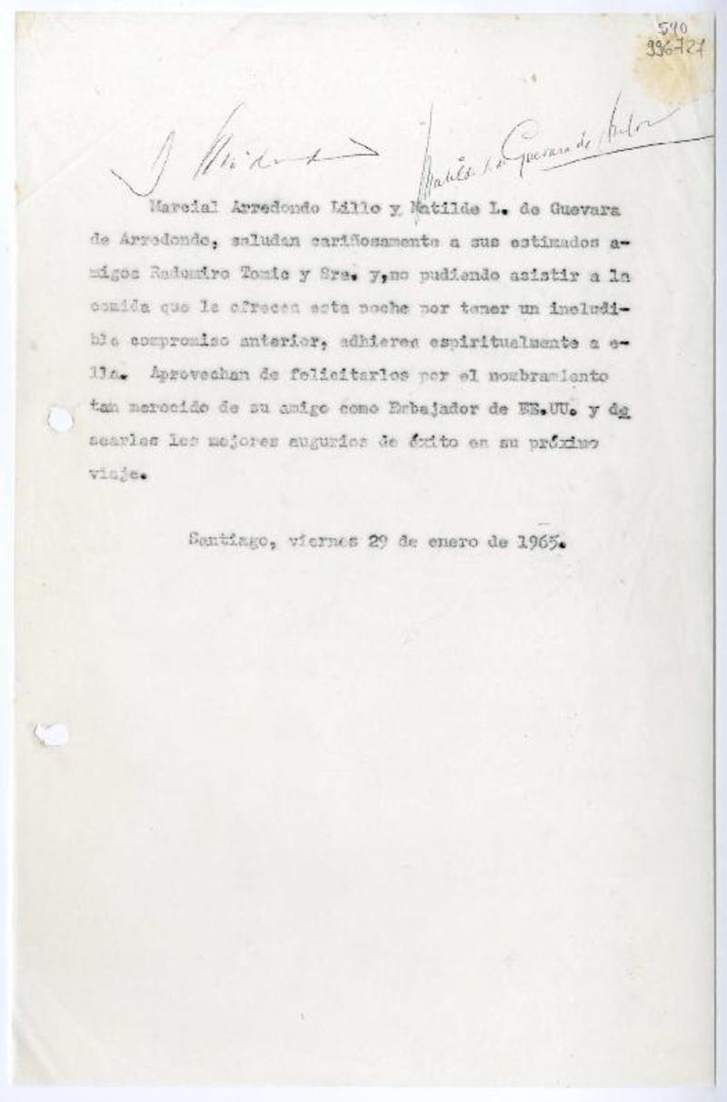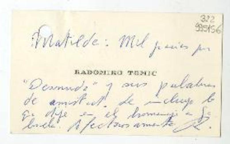 [Tarjeta] [1959, Santiago] [a] Matilde [manuscrito] Radomiro Tomic.