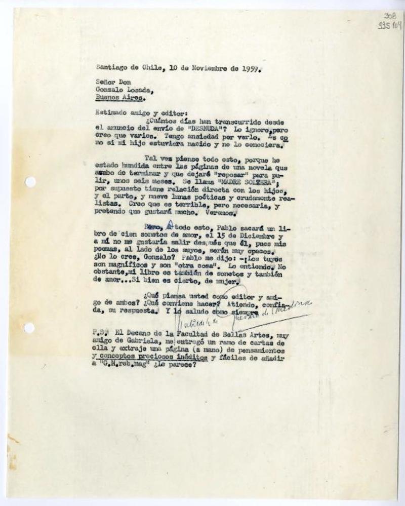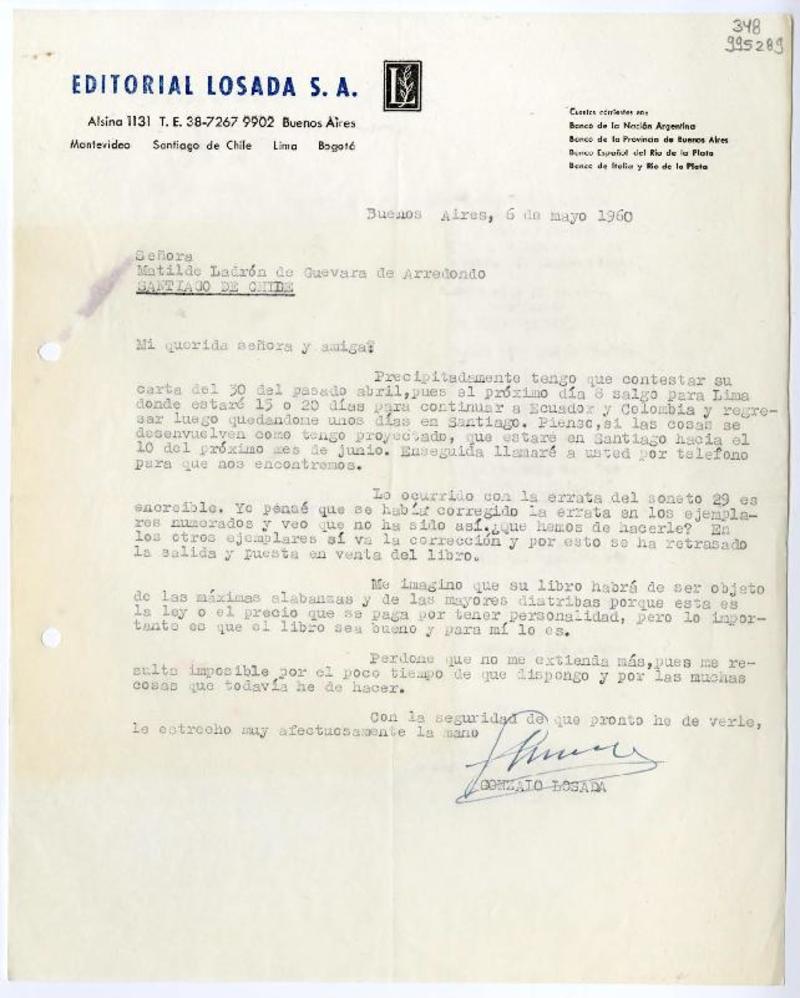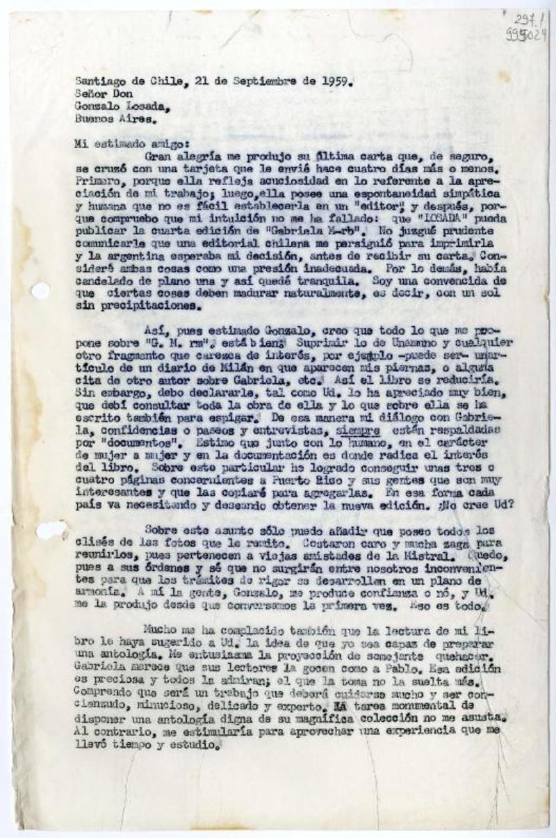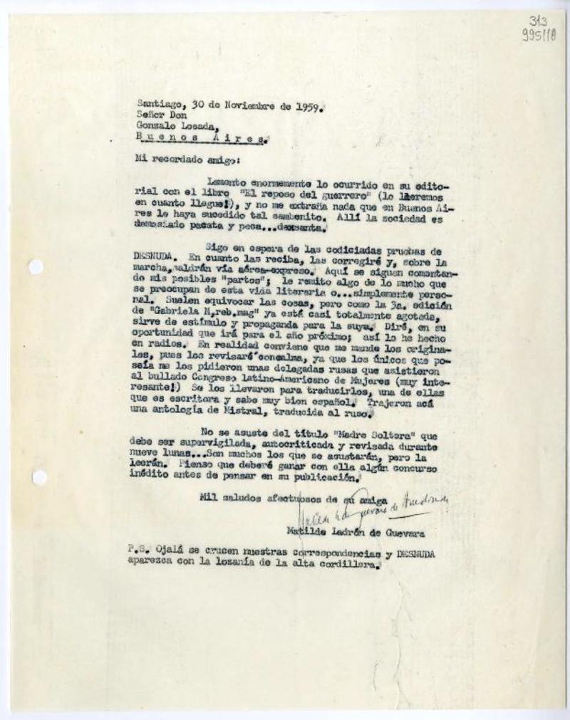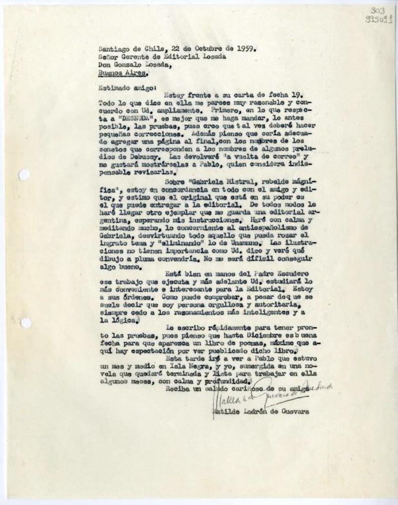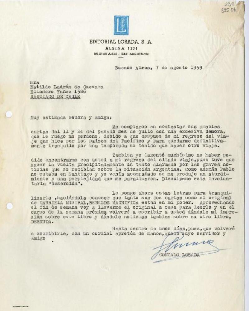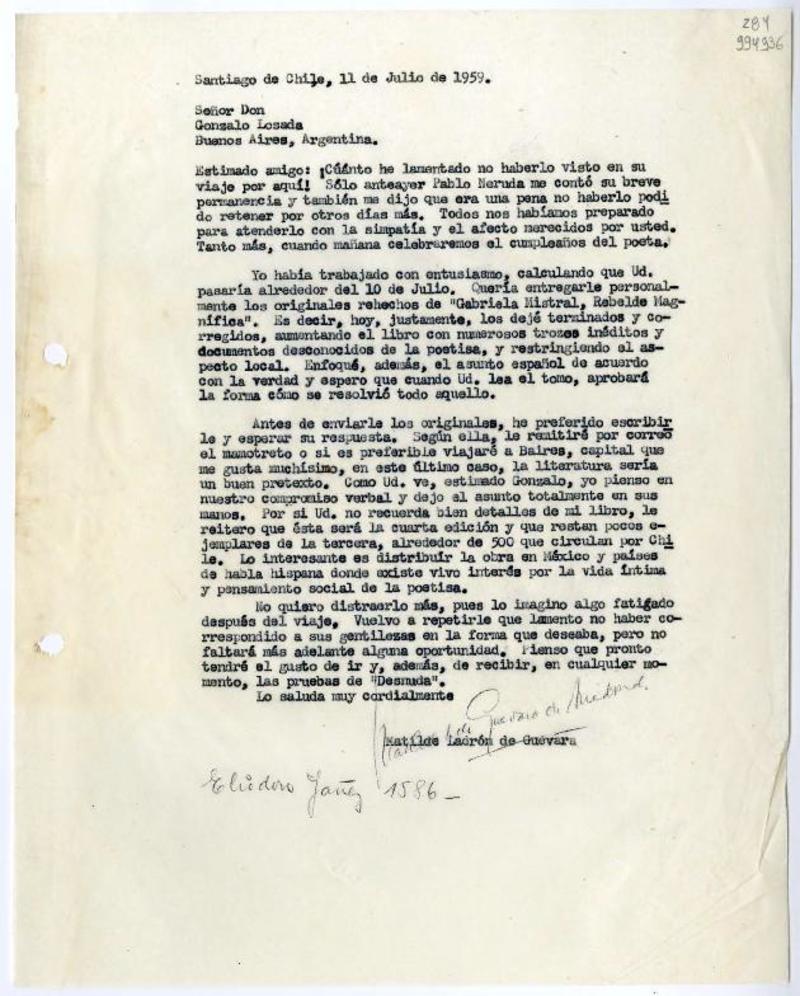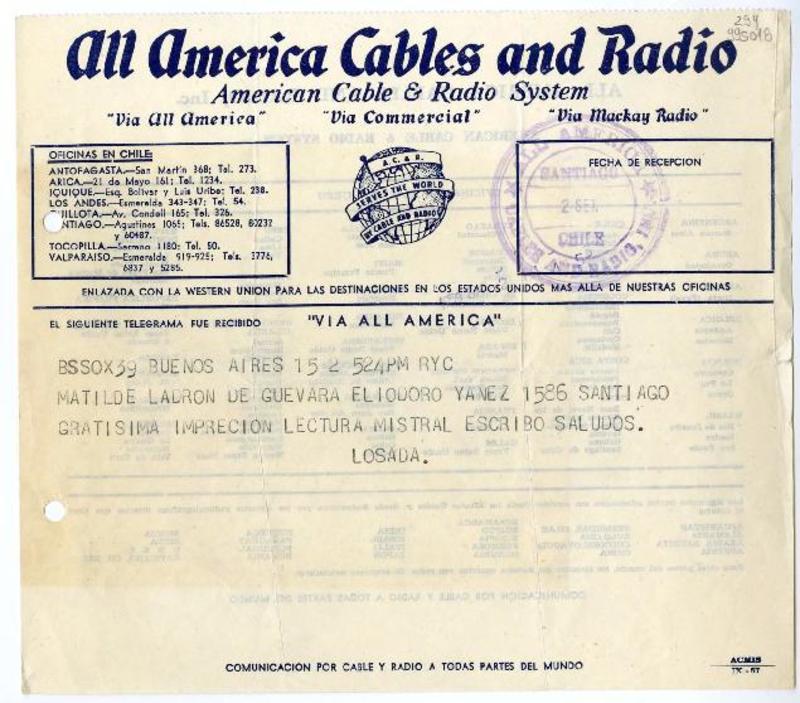 [Telegrama] 1959 septiembre 2, Buenos Aires [a] Matilde Ladrón de Guevara, Santiago [manuscrito] [Gonzalo] Losada.