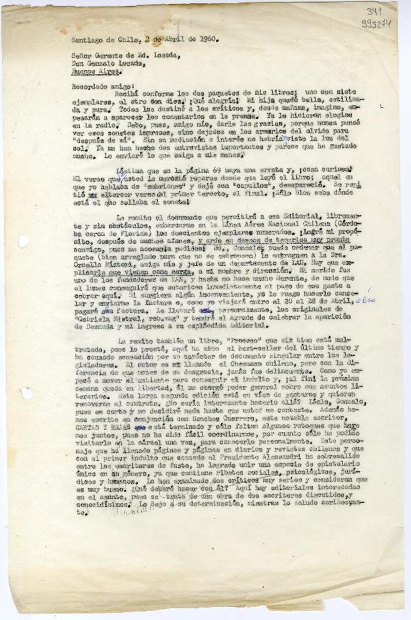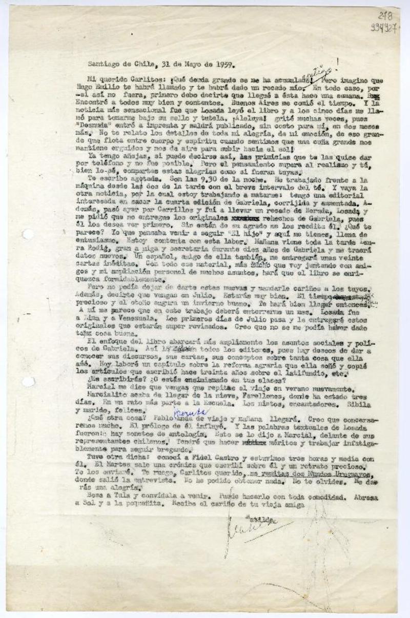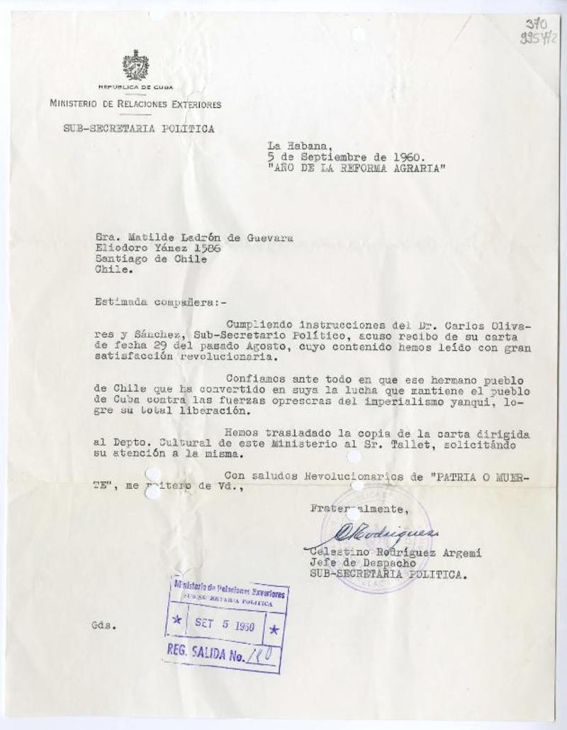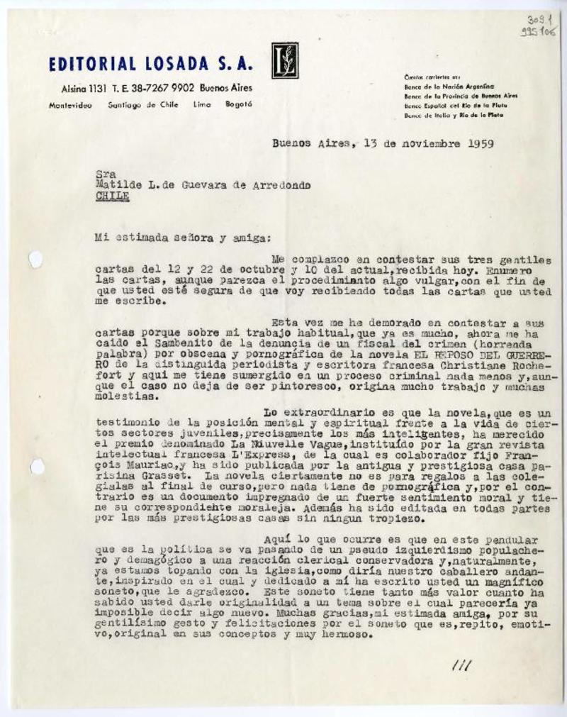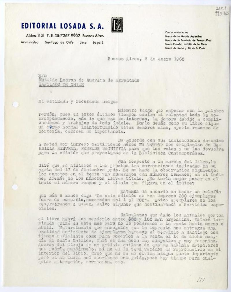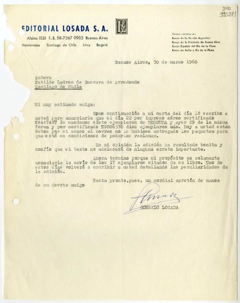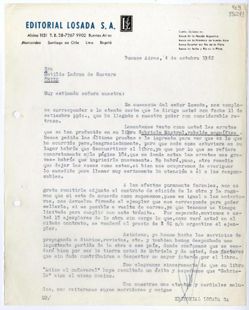 [Telegrama] 1959 septiembre 2, Buenos Aires [a] Matilde Ladrón de Guevara, Santiago [manuscrito] [Gonzalo] Losada.