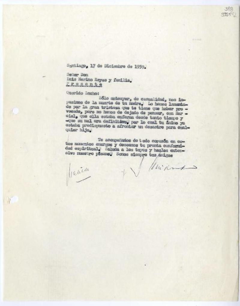 [Tarjeta] 1959 diciembre 22, [Santiago] [a] [Matilde Ladrón de Guevara] [manuscrito] René Hurtado.
