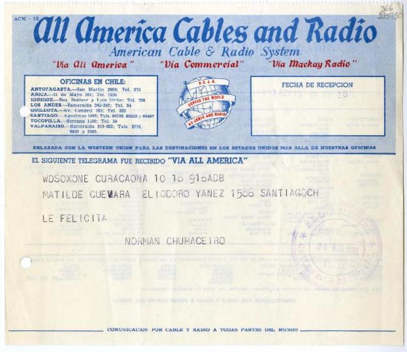 [Telegrama] 1960 agosto 18, Curazao [a] Matilde Guevara, Santiago [manuscrito] Norman Chumaceiro.