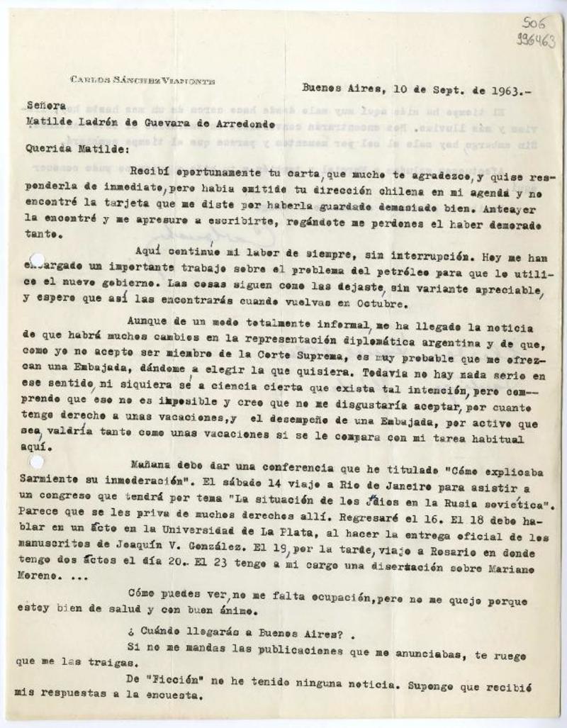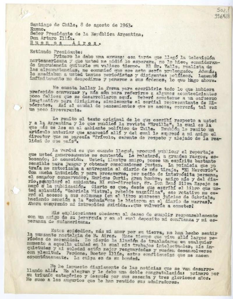 Reportaje de la escritora chilena Matilde Ladrón de Guevara, al doctor Arturo U. Illia [manuscrito] Matilde Ladrón de Guevara.
