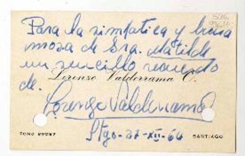 [Tarjeta] 1964 diciembre 27, Santiago [a] Matilde [manuscrito] Lorenzo Valderrama O.