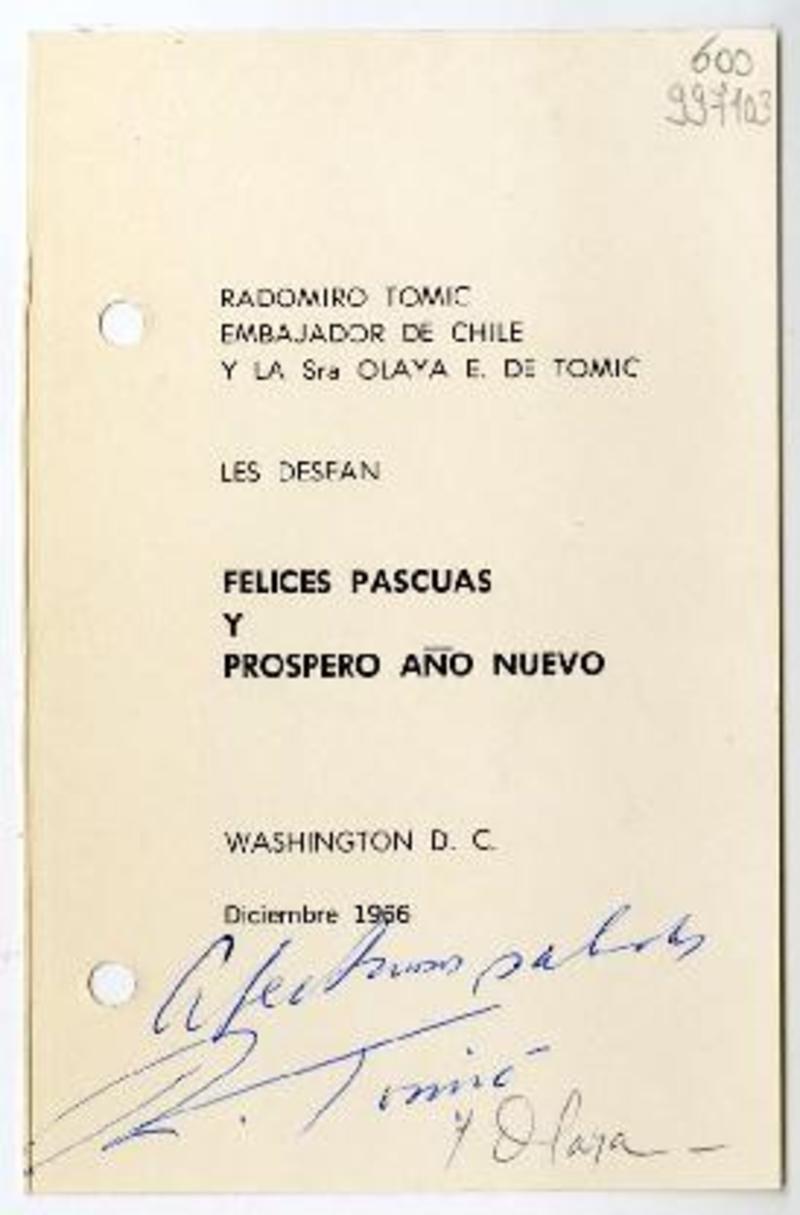 [Tarjeta] 1966 diciembre, Washington D. C. [a] Matilde Ladrón de Guevara [manuscrito] Radomiro Tomic.