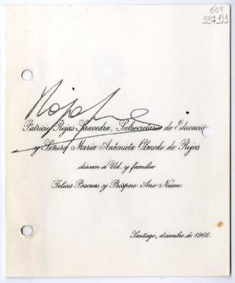 [Tarjeta] 1966 diciembre Santiago [a] Matilde Ladrón de Guevara [manuscrito] Patricio Rojas Saavedra.