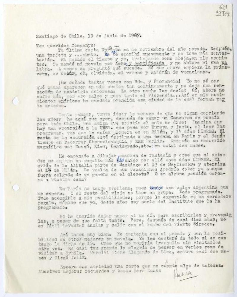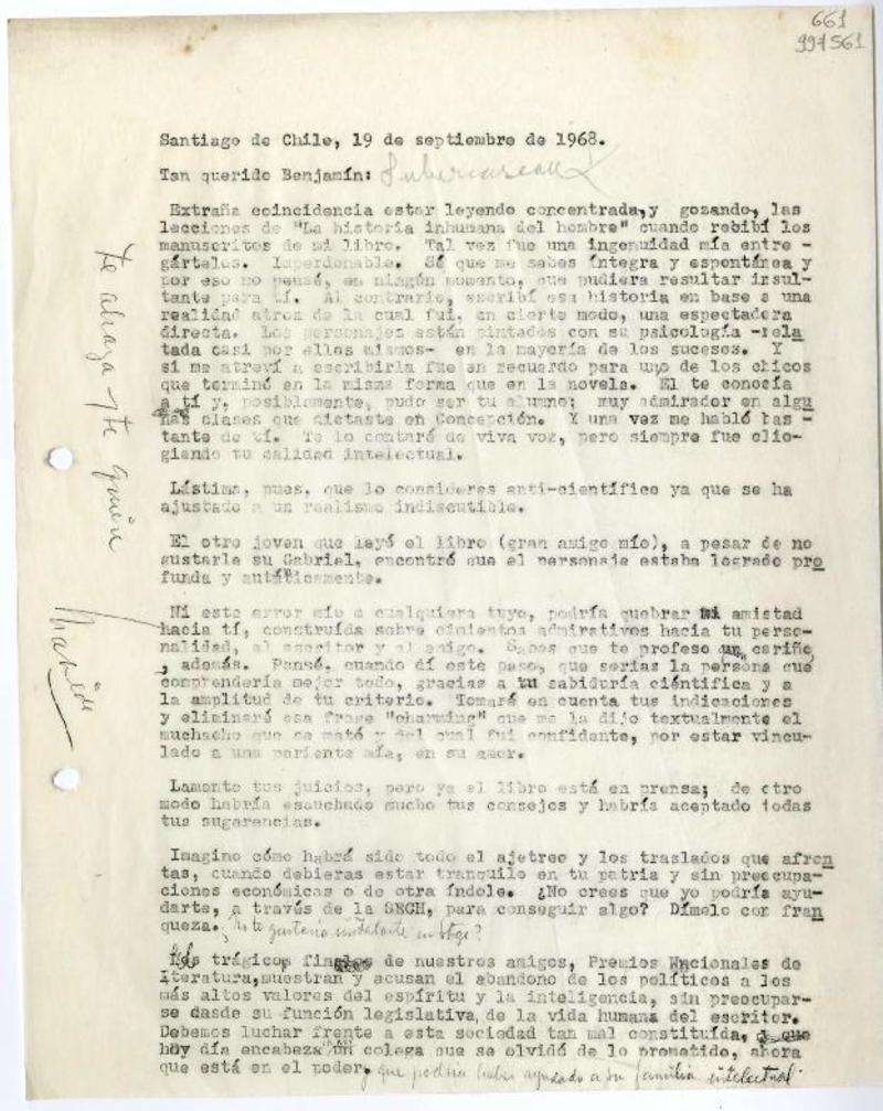 Préndez Saldías, Carlos - Correspondencia - Autores chilenos - Manuscritos chilenos - Morgado, Benjamín - Ladrón de Guevara, Matilde