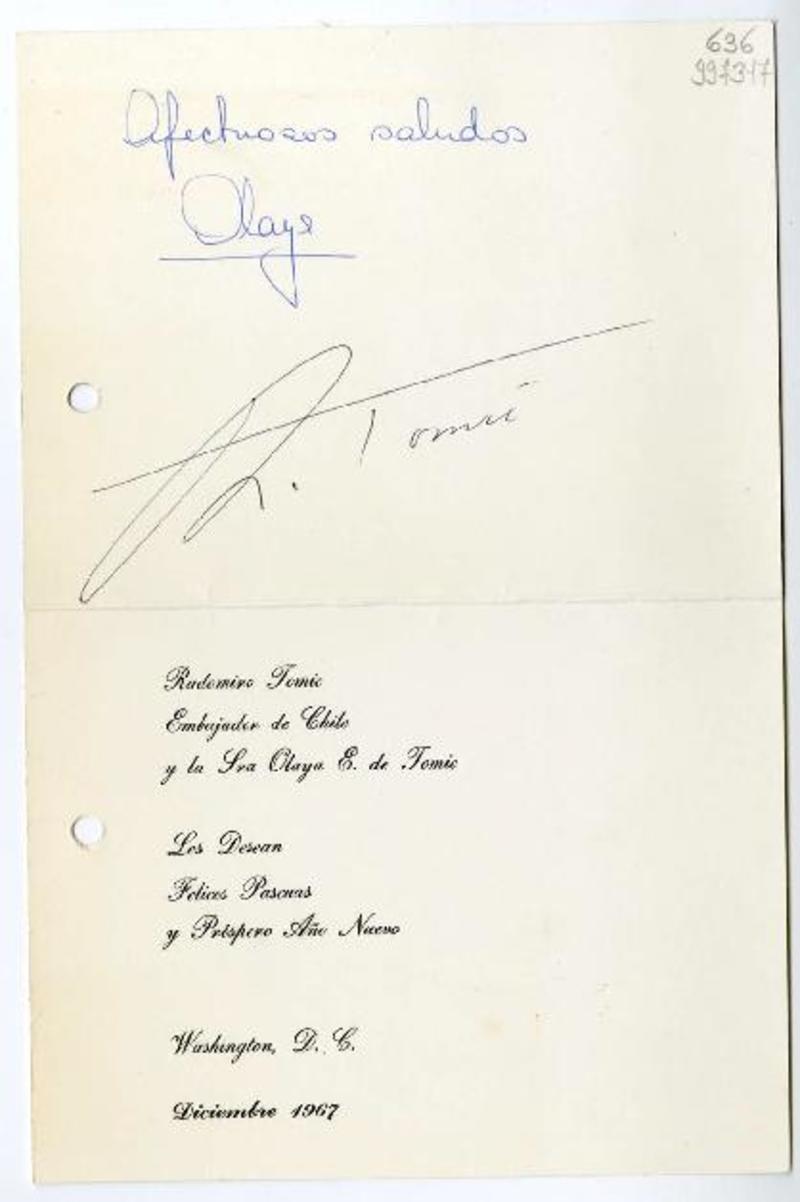 [Tarjeta] 1967 diciembre, Washington [a] Matilde Ladrón de Guevara [manuscrito] Radomiro Tomic.