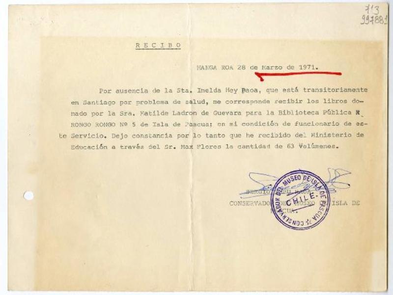 [Recibo] 1971 marzo 28, Hanga Roa [manuscrito] Sergio Rapu Haoa.