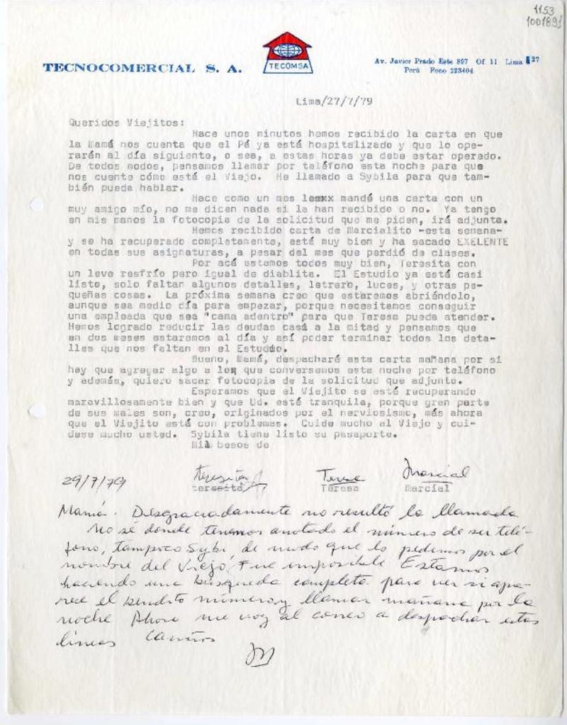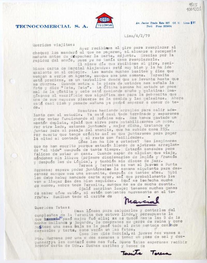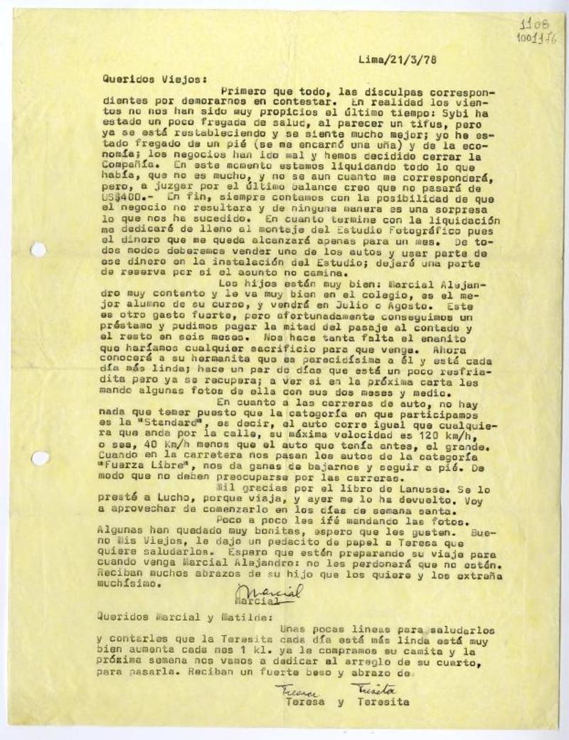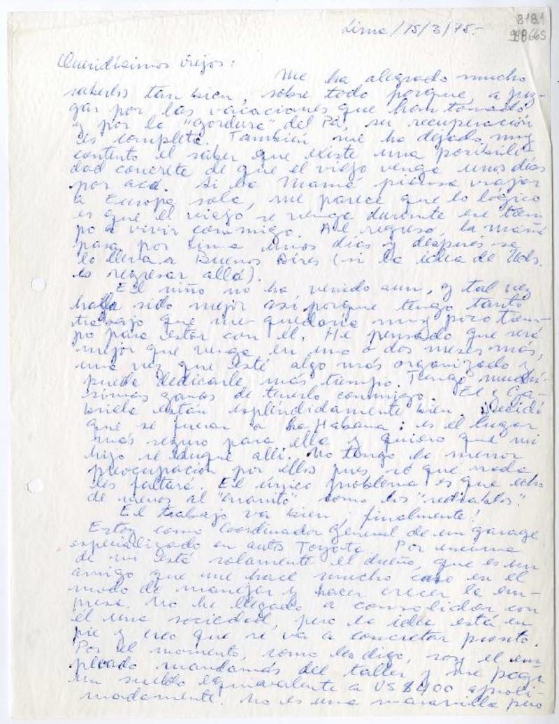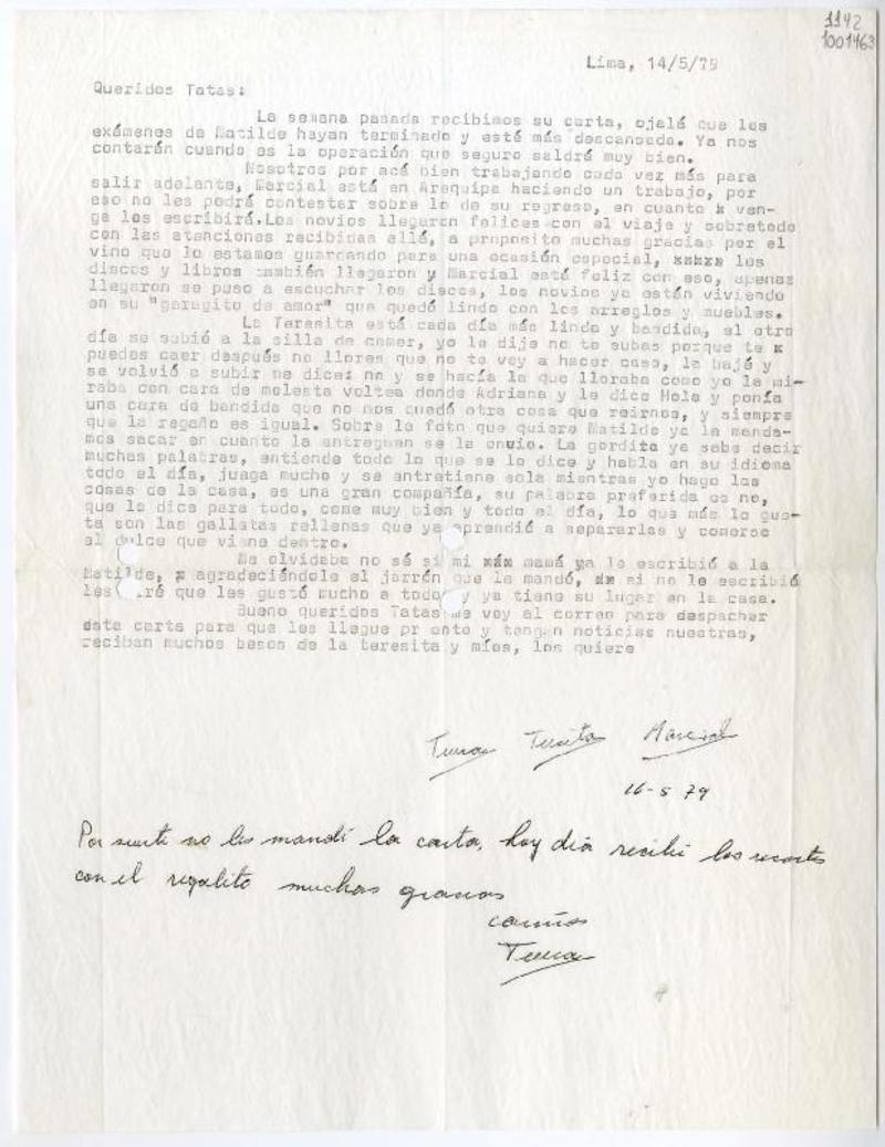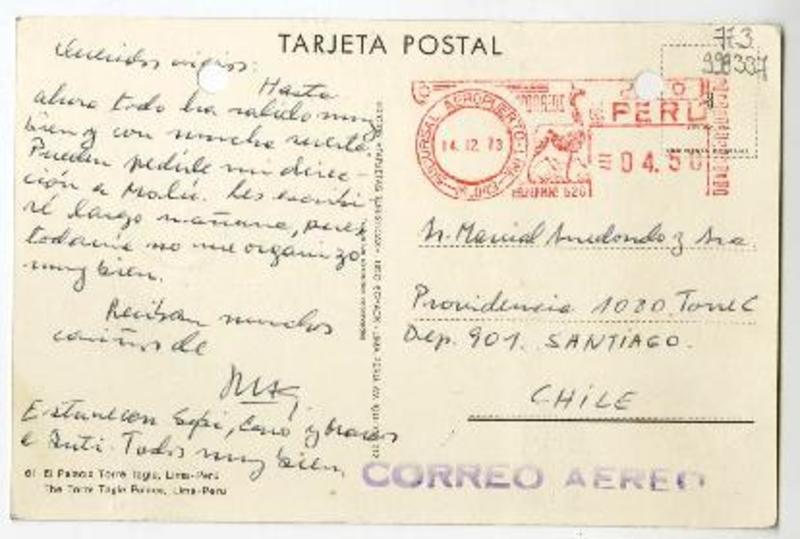 [Tarjeta Postal] 1973 diciembre 14, Perú [a] Queridos viejos [manuscrito] Mag [Marcial Arredondo Guevara].
