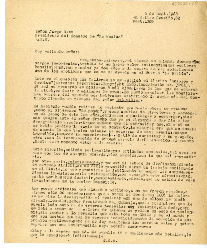 [Carta] 1968 septiembre 6, Santiago, Chile [a] Jorge Cash [manuscrito] Magdalena Petit.