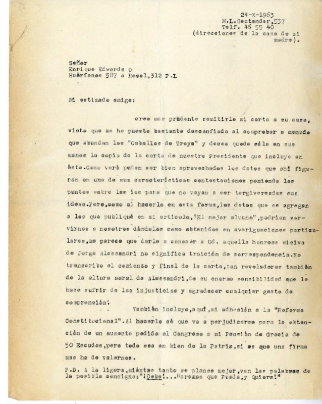 [Carta] 1963 octubre 24, Santiago, Chile [a] Enrique Edwards Orrego [manuscrito] Magdalena Petit.