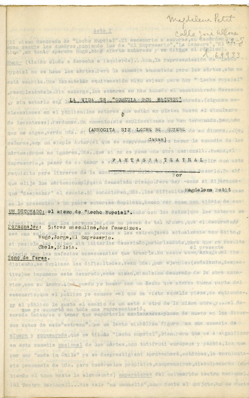 La vida es comedia por hacerse [manuscrito] Magdalena Petit.