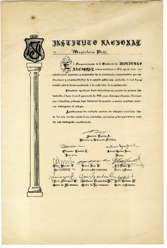 Diploma del Instituto Nacional [manuscrito] Magdalena Petit.