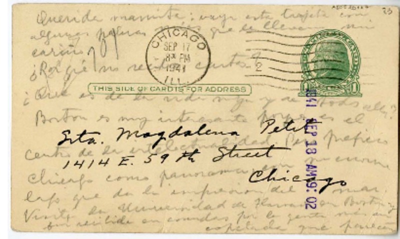 [Tarjeta] 1941, Boston [a su madre] [manuscrito] Magdalena Petit.