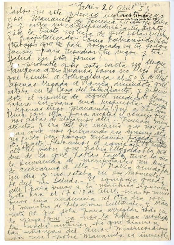 [Carta] 1953 abril 20, París, Francia [a] Carlos [Italia] [manuscrito] Stella Corvalán.