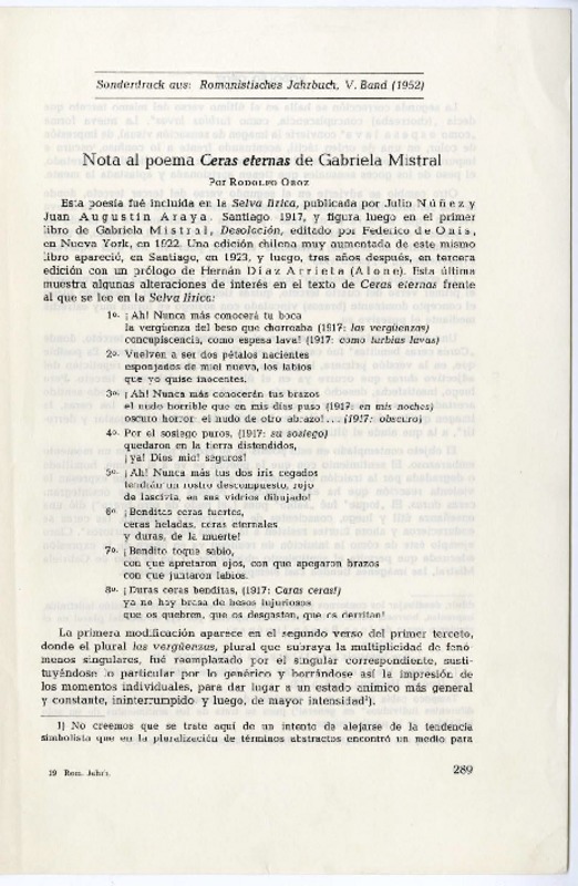 Nota al poema "Ceras eternas" de Gabriela Mistral [manuscrito] Rodolfo Oroz Scheibe.