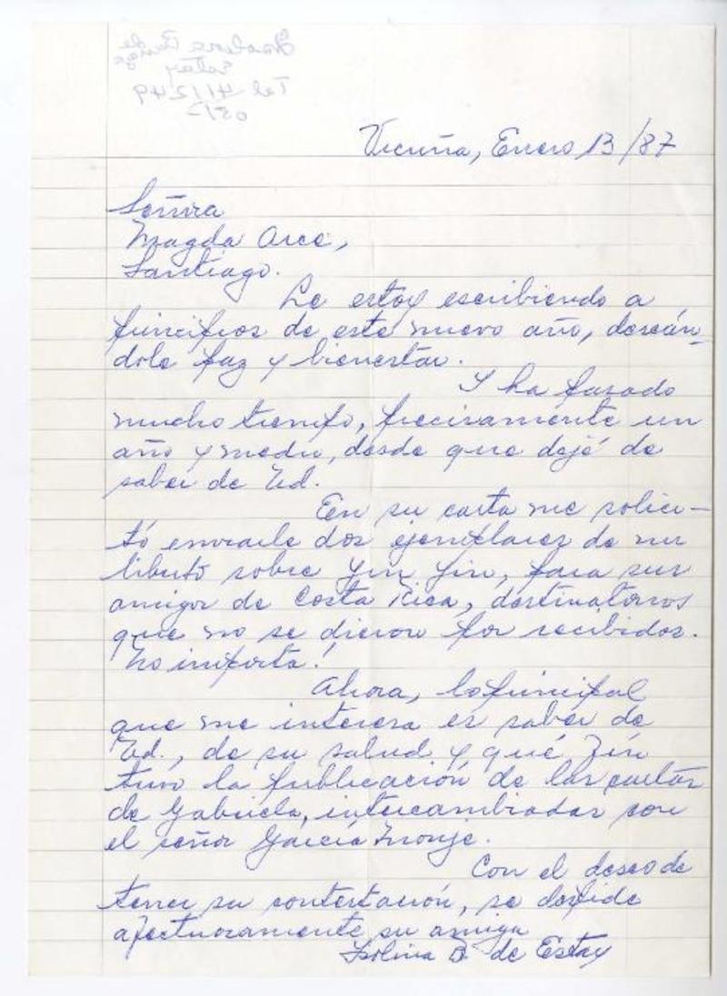 Chile [a] Magda Arce carta, 1987, [manuscrito] Isolina Barraza de Estay.