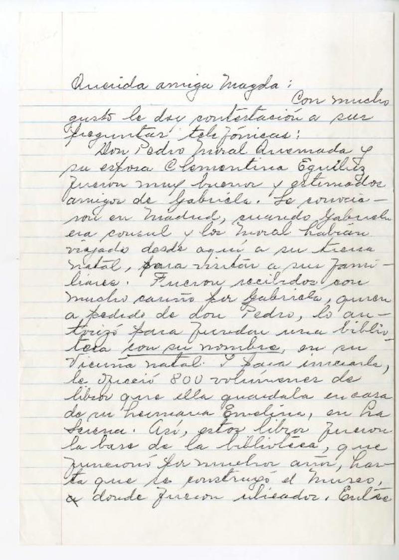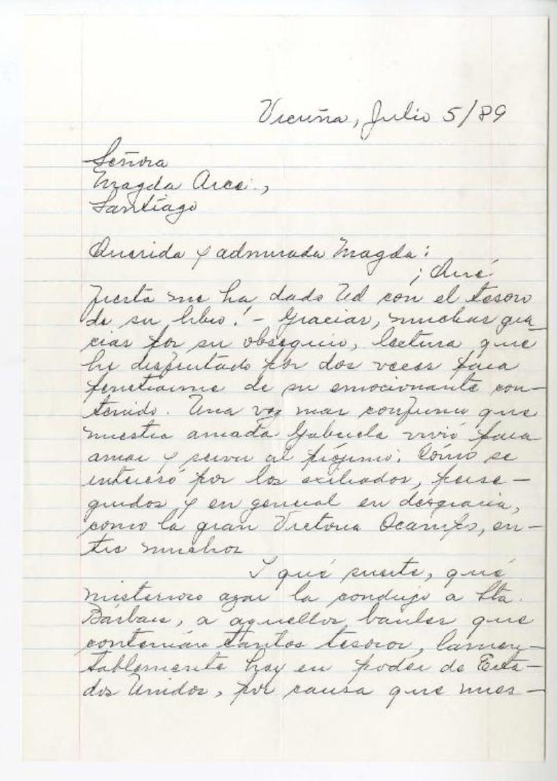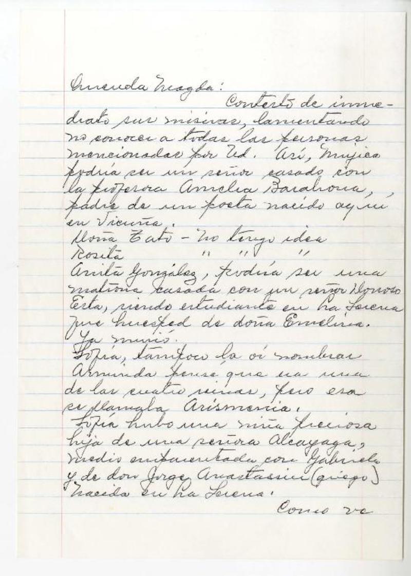 Vicuña, Chile [a] Magda Arce carta, 1989, [manuscrito] Isolina Barraza de Estay.