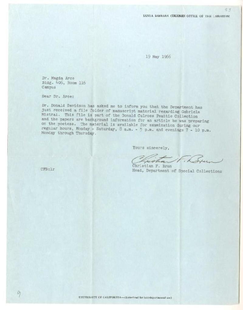 University of California, Department of Spanish and Portuguese, California [a] Magda Arce, University of California, Santa Barbara Carta, 1966 mayo 14, [manuscrito] Arturo Torres Rioseco.