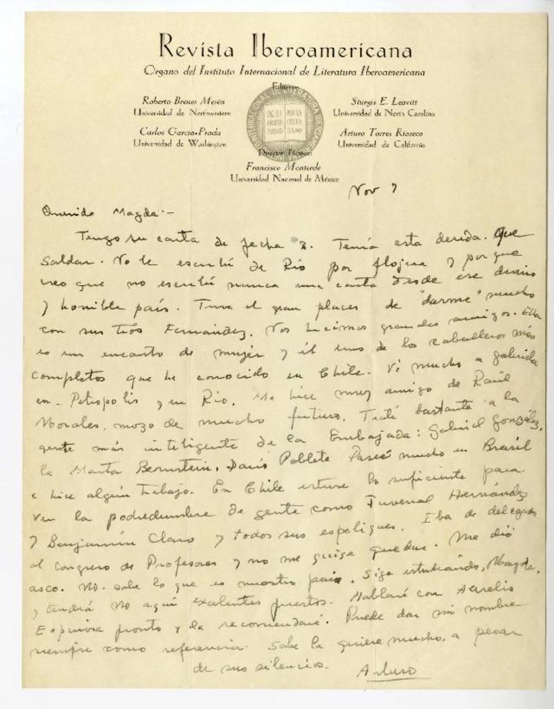 Santiago, Chile [a] Magda Arce. carta, 1945 Noviembre 7, [manuscrito] Arturo Torres Rioseco.