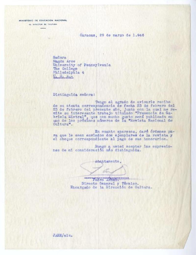 Caracas, [Venezuela] [a] Magda Arce, University of Pennsylvania, The College carta, 1946, [manuscrito] Pedro Arnal.