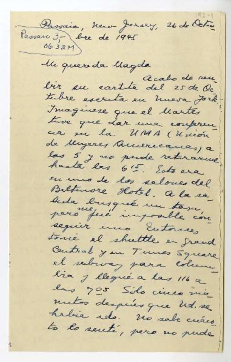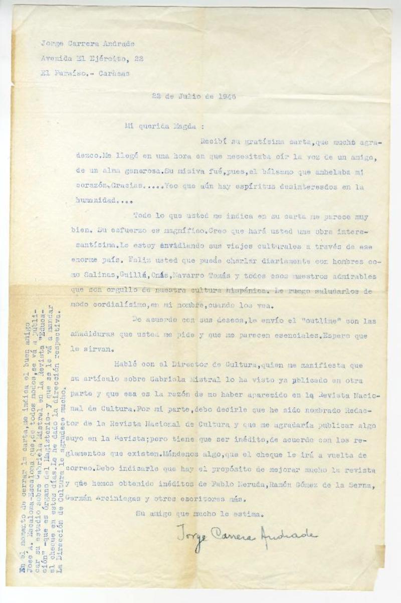 Caracas, Venezuela [a] Magda Arce, Estados Unidos carta, 1946, [manuscrito] Jorge Carrera Andrade.