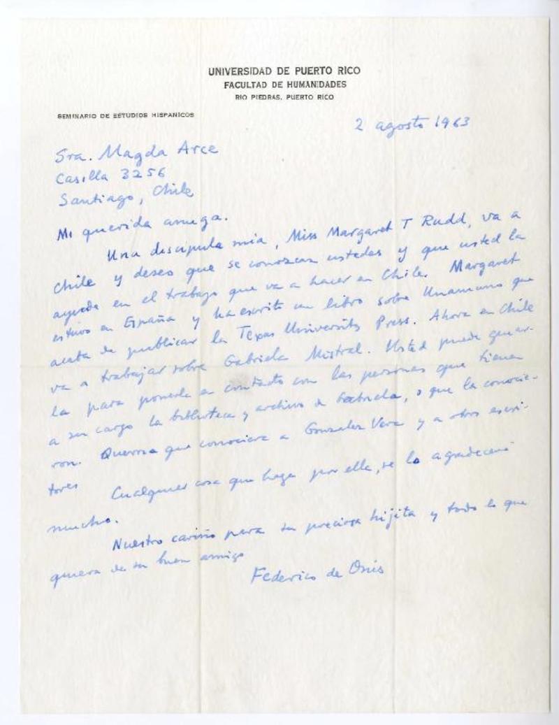 Rio Piedras, Puerto Rico [a] Magda Arce, Santiago, Chile. carta, 1963, [manuscrito] Federico de Onís.