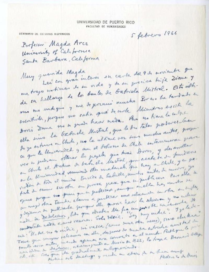 Rio Piedras, Puerto Rico [a] Magda Arce, University of California, Santa Barbara, California. carta, 1966, [manuscrito] Federico de Onis.