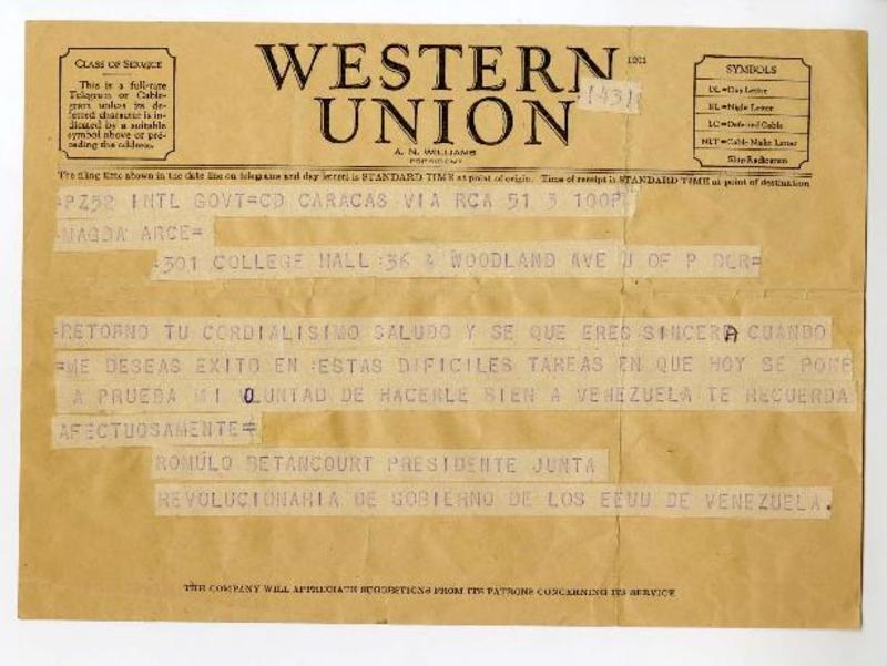 Caracas, Venezuela [a] Magda Arce, Estados Unidos Telegrama, cerca de 1940, [manuscrito] Rómulo Betancourt.