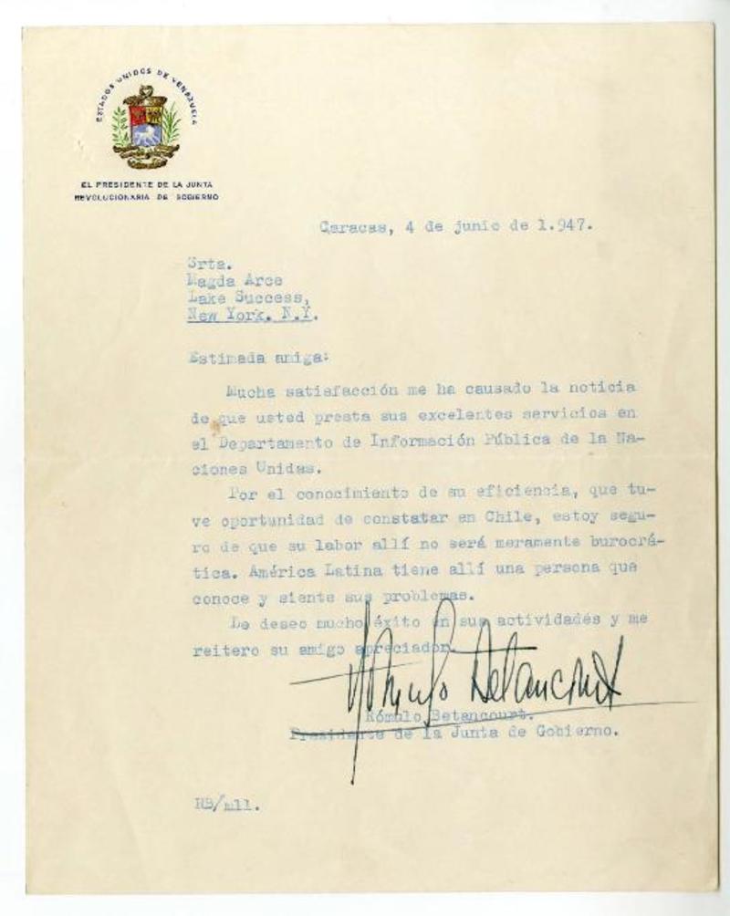 Caracas, Venezuela [a] Magda Arce, New York carta, 1945 junio 4, [manuscrito] Rómulo Betancourt.
