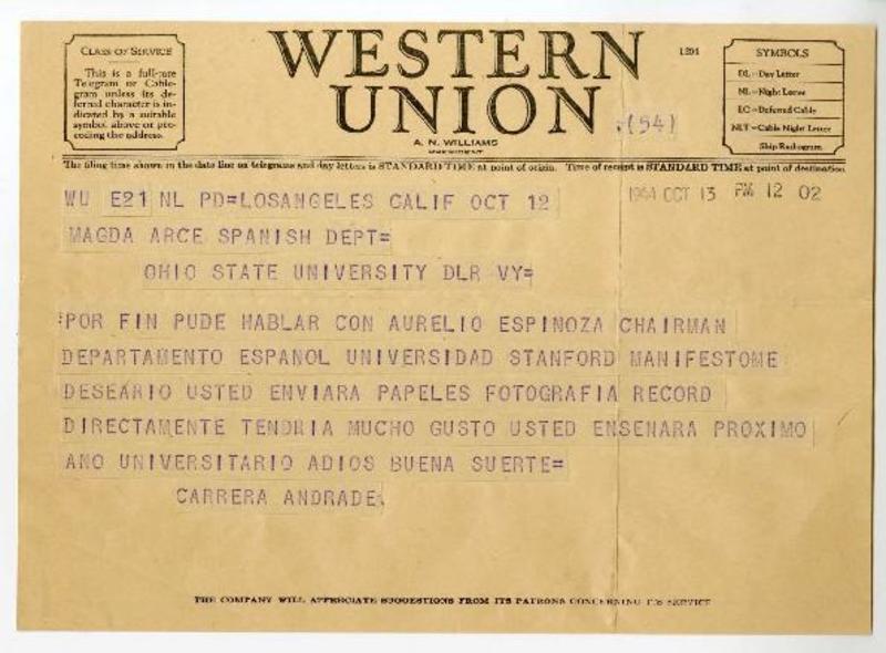 Los Angeles, California [a] Magda Arce, Ohio State University Telegrama, 1944 octubre 13, [manuscrito] Jorge Carrera Andrade.