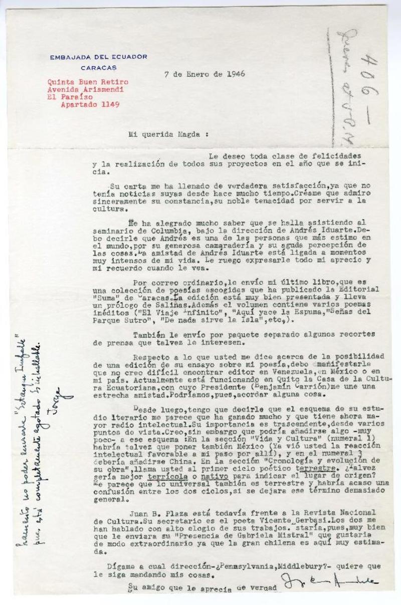 Caracas, Venezuela [a] Magda Arce Carta 1946 enero 7, [manuscrito] Jorge Carrera Andrade.
