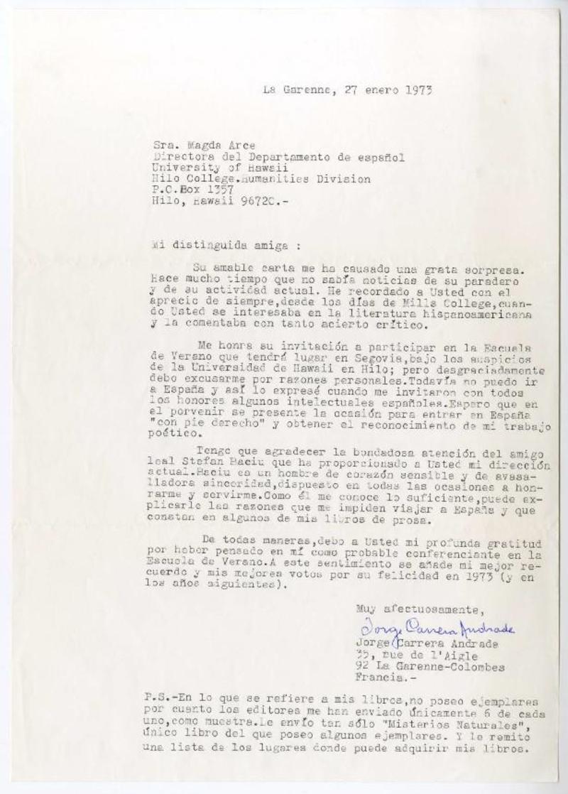 La Garenne, Francia [a] Magda Arce, Directora del Departamento de Español, University of Hawwaii carta, 1973 enero 27, [manuscrito] Jorge Carrera Andrade.