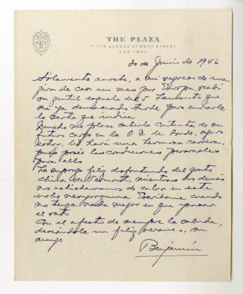 Santiago, Chile [a] Magda Arce, New York Carta, 1946 , [manuscrito] Gabriel González Videla.