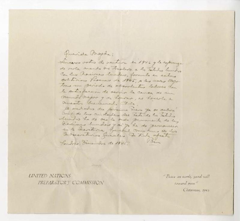 Londres, Inglaterra [a] Magda Arce Tarjeta, 1945 diciembre, [manuscrito] Bejamin Cober.
