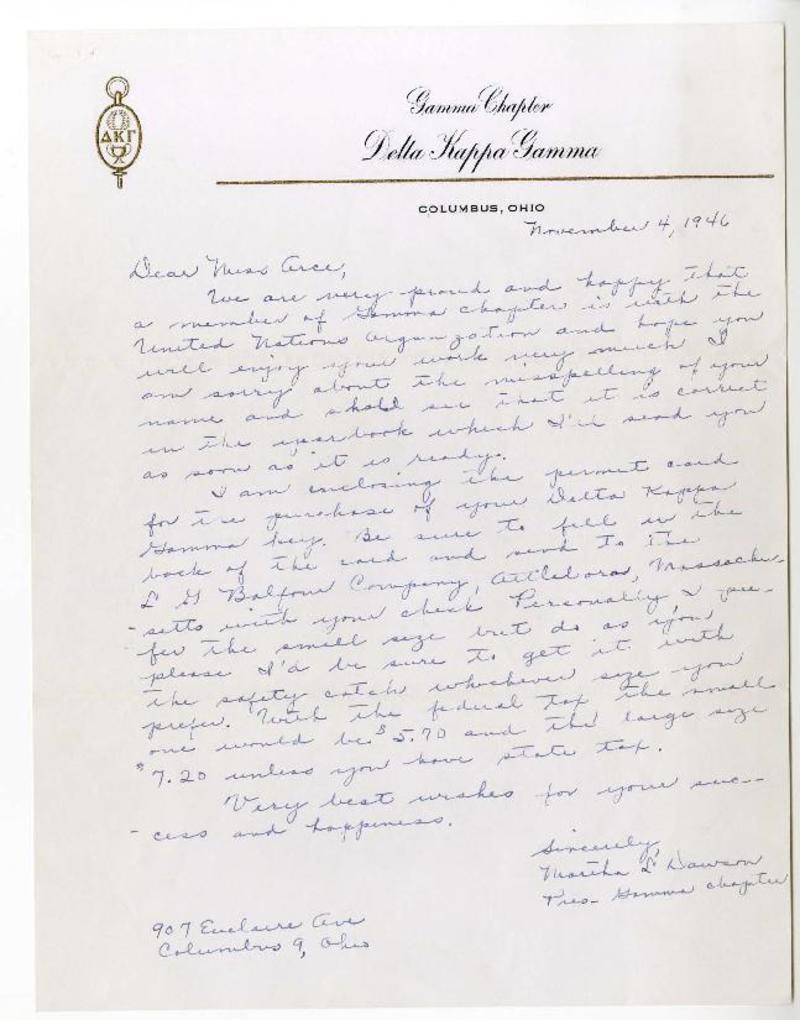 Columbus, Ohio [a] Magda Arce Carta, 1946 noviembre 4, [manuscrito] Martha L. Dawson.