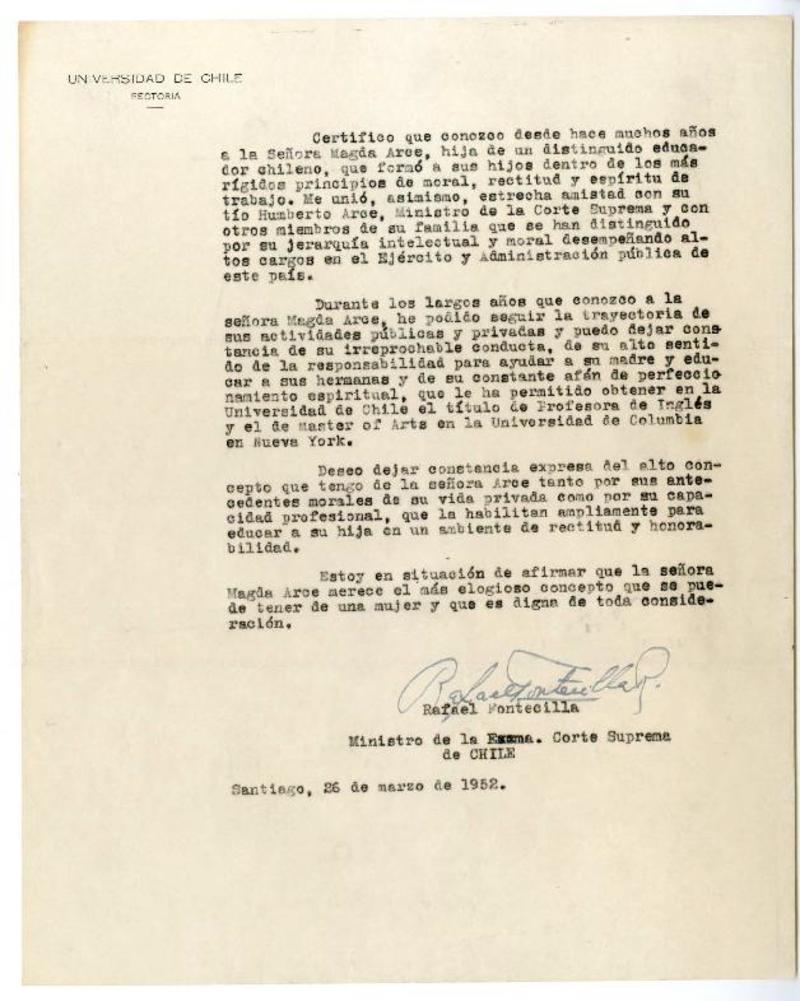 Santiago, Chile [a] Magda Arce Carta, 1952 marzo 26, [manuscrito] Rafael Fontecilla.