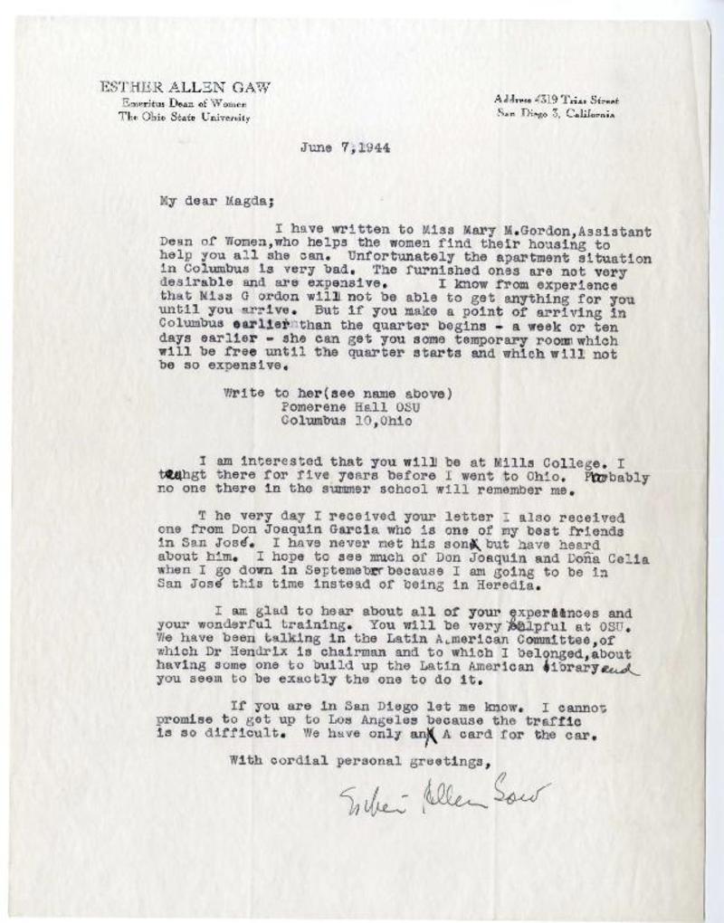 Ohio [a] Magda Arce Carta, 1944 june 7, [manuscrito] Esther Allen Gaw.