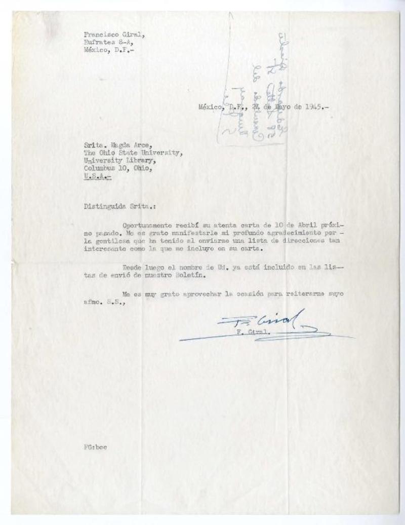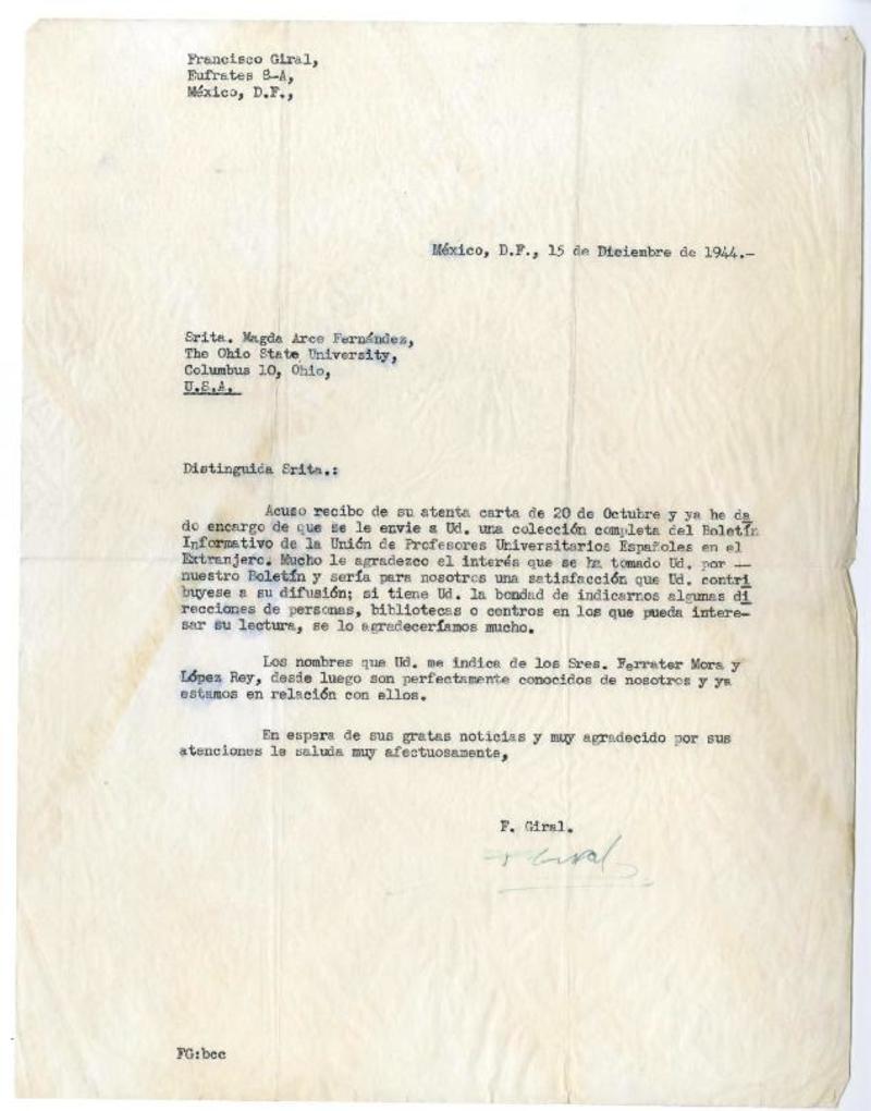 México, D.F. [a] Magda Arce Fernández, The Ohio State University, Columbus, Ohio Carta, 1944 diciembre 15, [manuscrito] Francisco Giral.