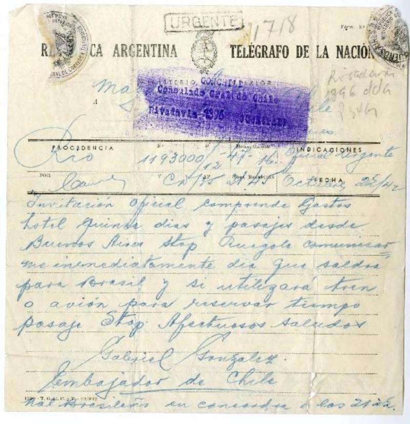 Rio de Janeiro, Brasil [a] Magda Arce, Consulado de Chile, Argentina Telegrama, 1942 octubre 22, [manuscrito] Gabriel González.