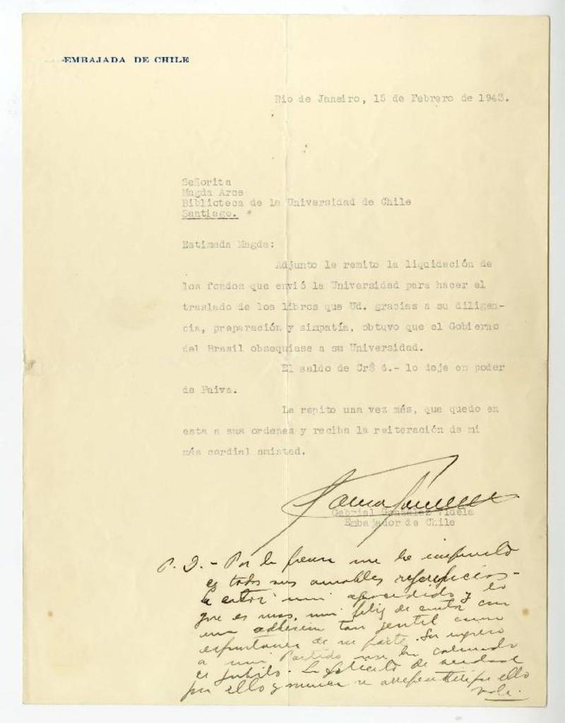 Rio de Janeiro, Brasil [a] Magda Arce, Biblioteca de la Universidad de Chile, Santiago, Chile Carta, 1943 febreo 27, [manuscrito] Gabriel González Videla.