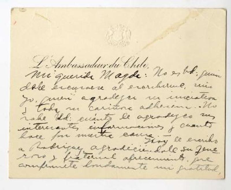 Santiago, Chile [a] Magda Arce. Carta, 1954 , [manuscrito] Gabriel González Videla.