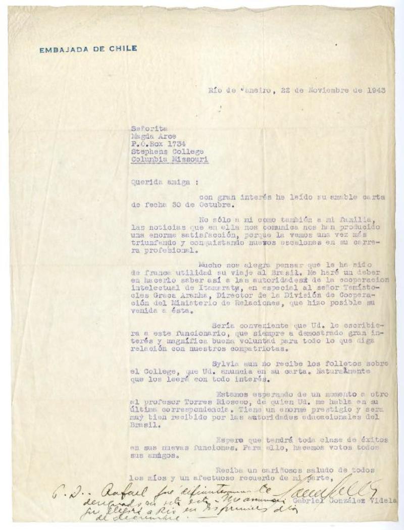 Rio de Janeiro, Brasil [a] Magda Arce, Stephens College, Columbia, Missouri Carta, 1943 noviembre 22, [manuscrito] Gabriel González Videla.