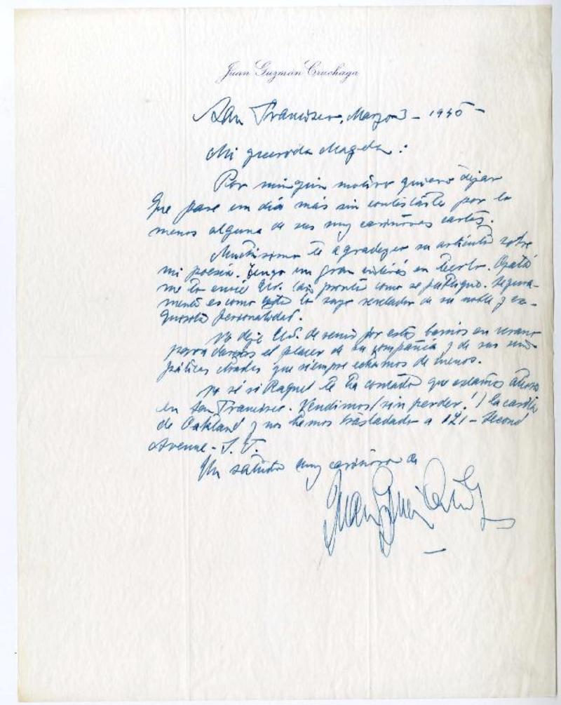 San Francisco, California [a] Magda Arce Carta, 1940, [manuscrito] Juan Guzmán Cruchaga.