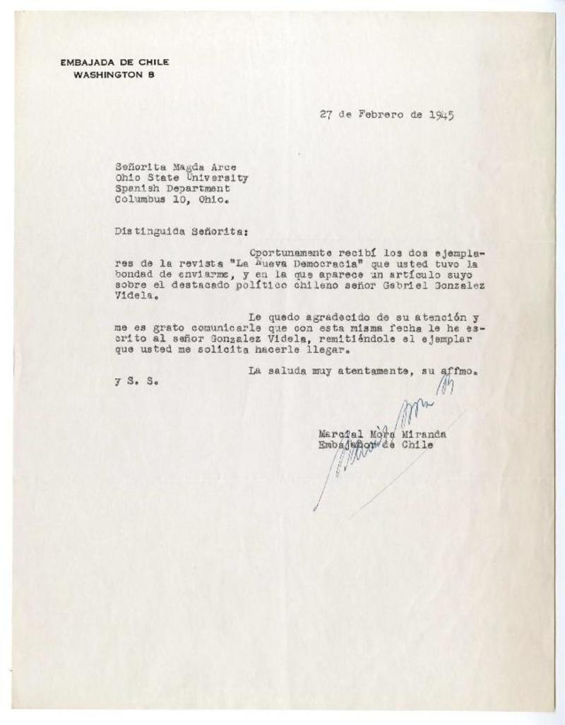 Washington D.C. [a] Magda Arce, Ohio State University, Spanish Department Carta, 1945 febrero 27, [manuscrito] Marcial Mora Miranda.