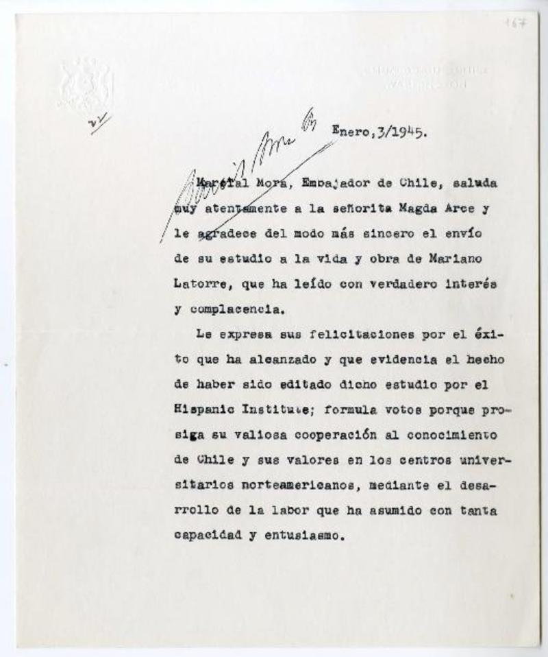 Washington D.C. [a] Magda Arce Carta, 1945 enero 03, [manuscrito] Marcial, Mora Miranda.